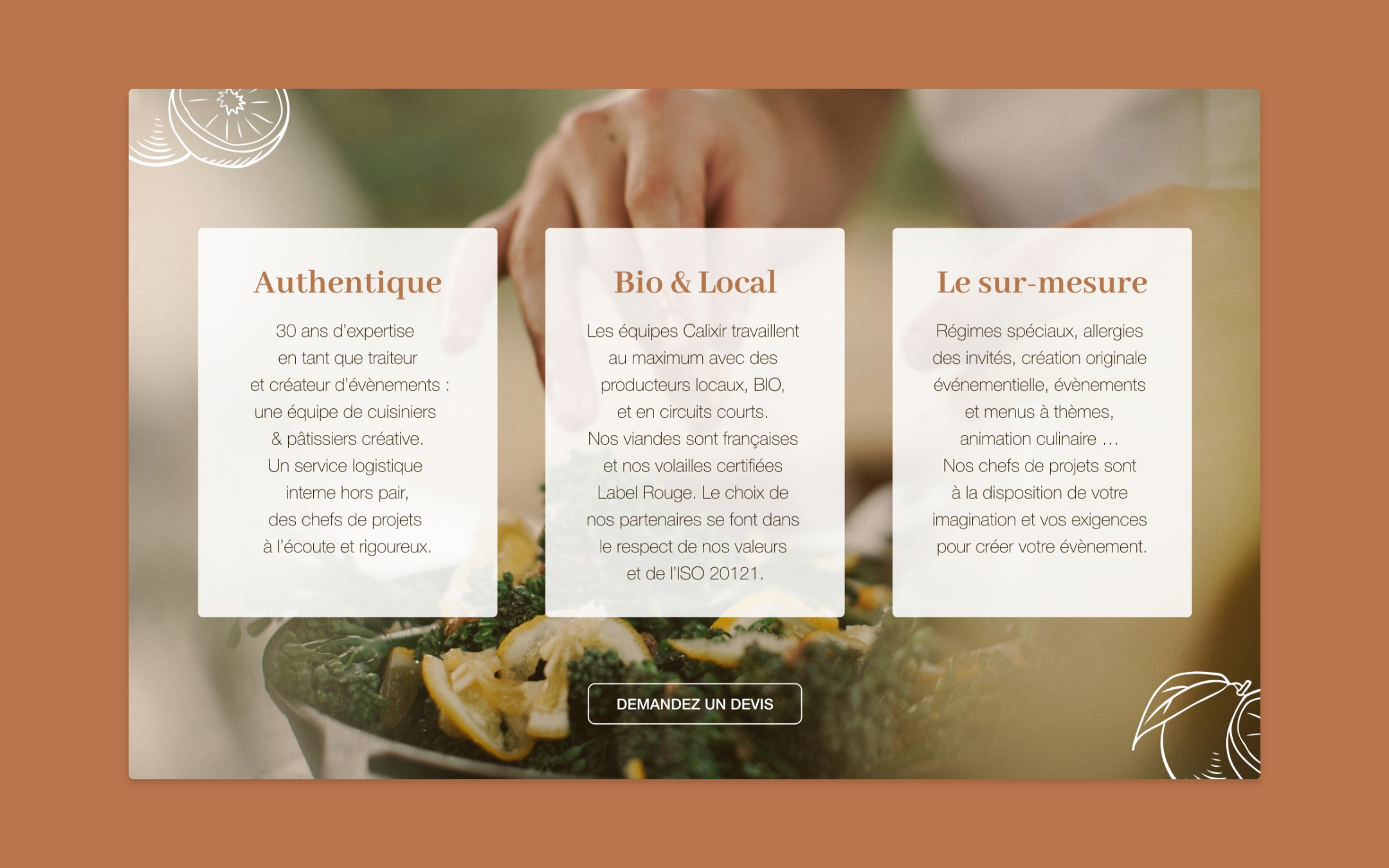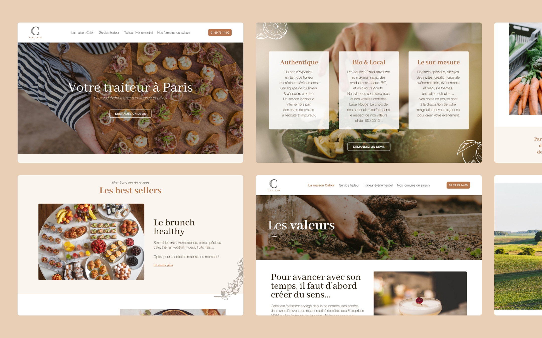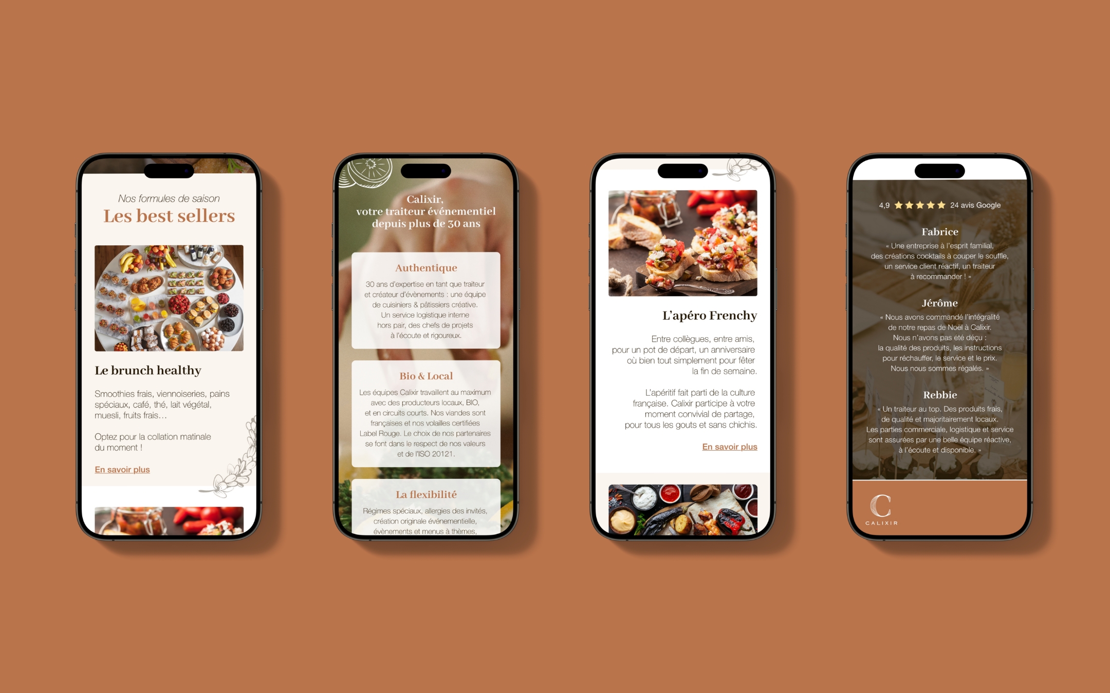 L’objectif est de construire un site internet qui façonne une identité visuelle distinctive pour Calixir, fusionnant habilement le savoir-faire et une touche gourmande dans l’esprit de ses clients. Tout au long de la navigation, notre objectif est de guider l’utilisateur à travers l’histoire et les services de Calixir, positionnant ainsi la marque en tant que leader face à ses concurrents. Un site offrant une expérience à la fois informative, captivante et stratégiquement positionnée.