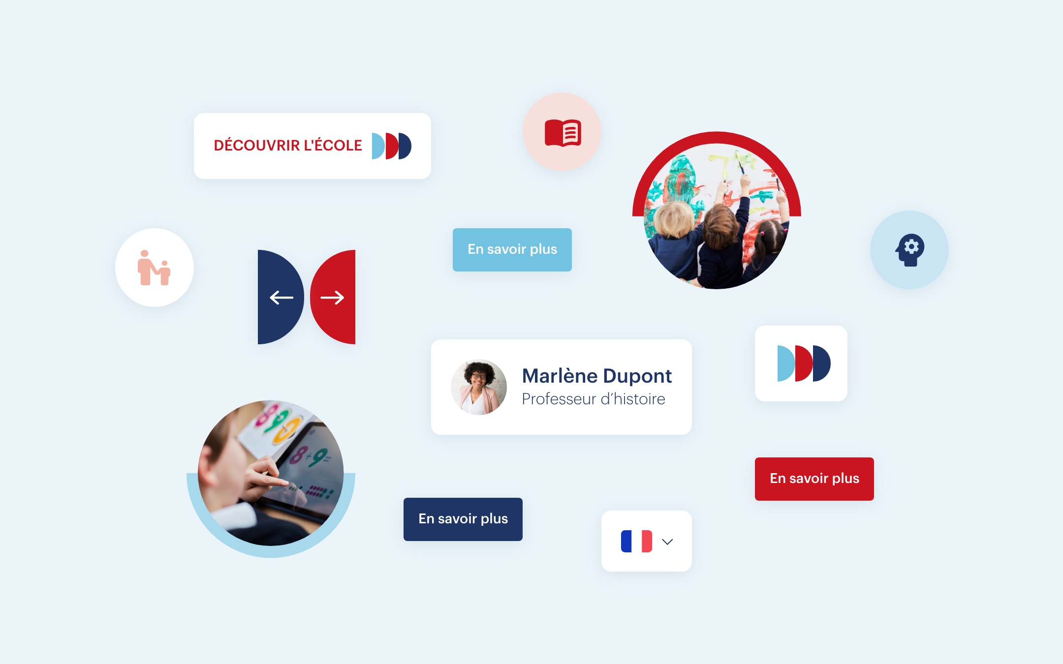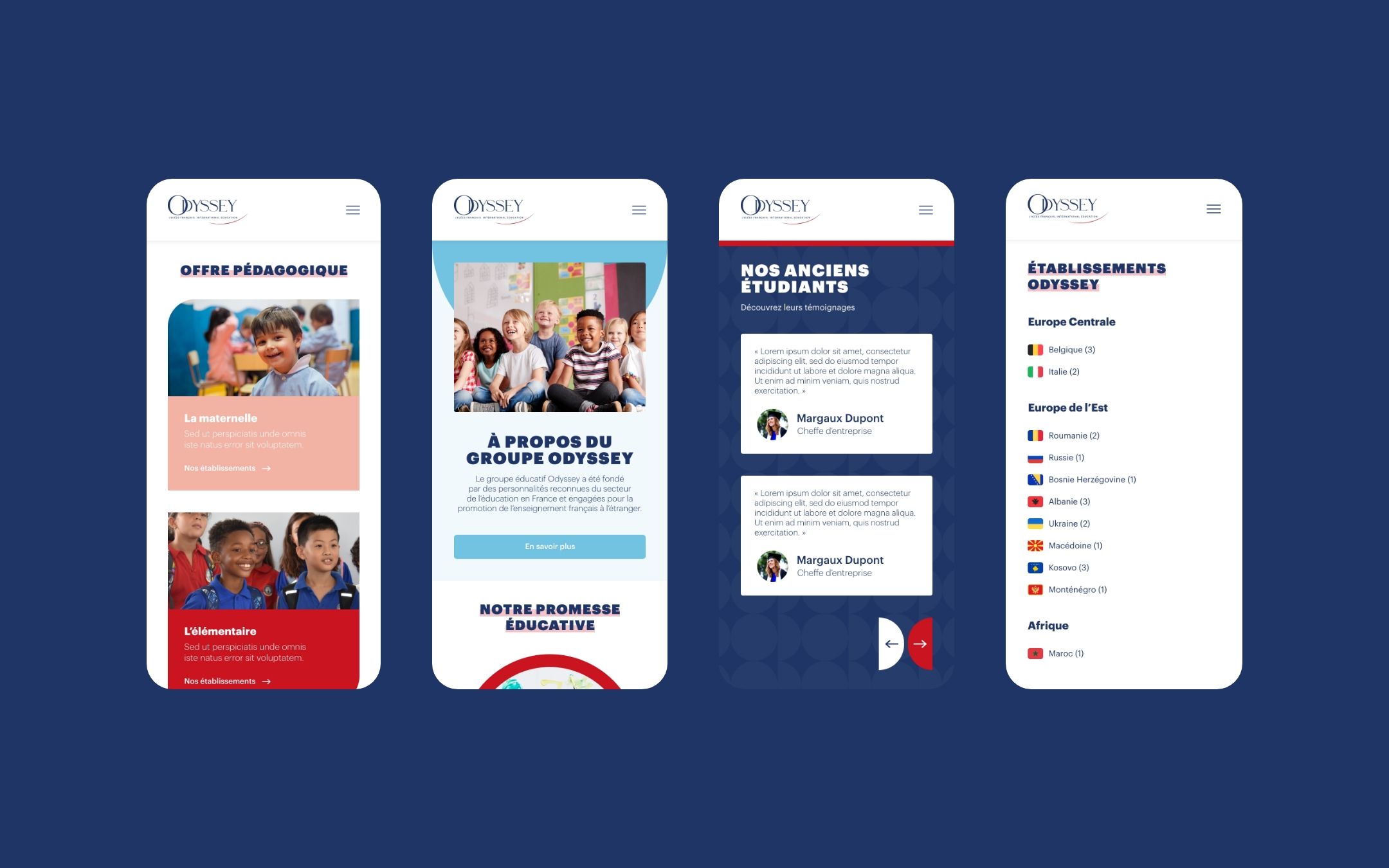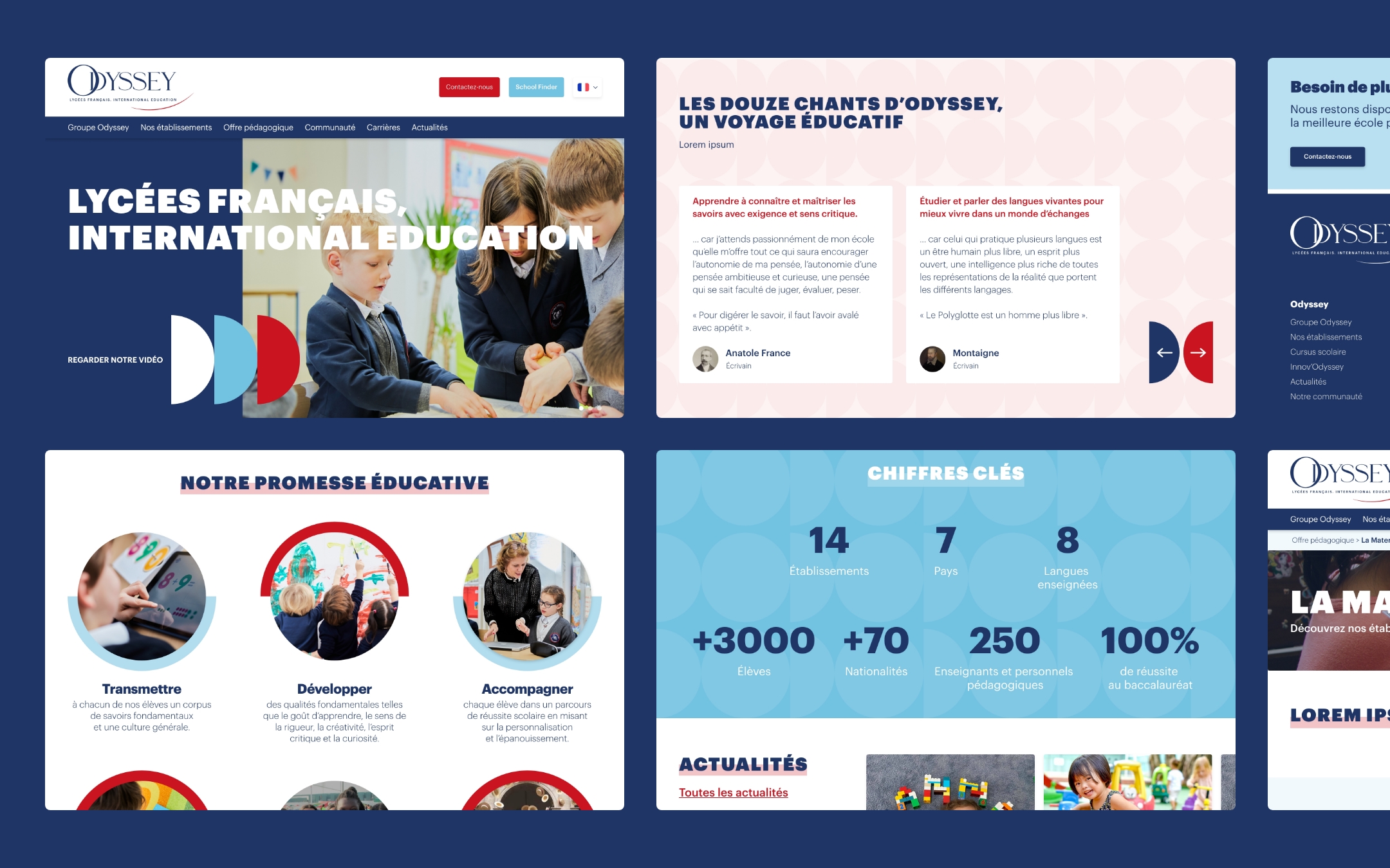 Objectif : la direction digitale doit adopter une identité visuelle à la fois ludique et généreuse, répondant ainsi aux attentes des parents et des enfants. La refonte doit être pensée pour intégrer de manière fluide la nouvelle identité grâce à un design system, permettant ainsi une adaptation aisée et facilitant le déploiement sur les sites internet des écoles partenaires du groupe Odyssey.